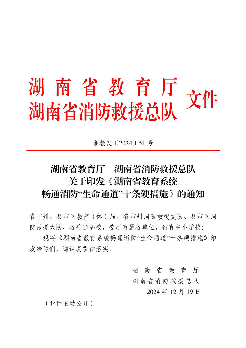湖南省教育厅 湖南省消防救援总队关于印发《湖南省教育系统畅通消防“生命通道”十条硬措施》的通知