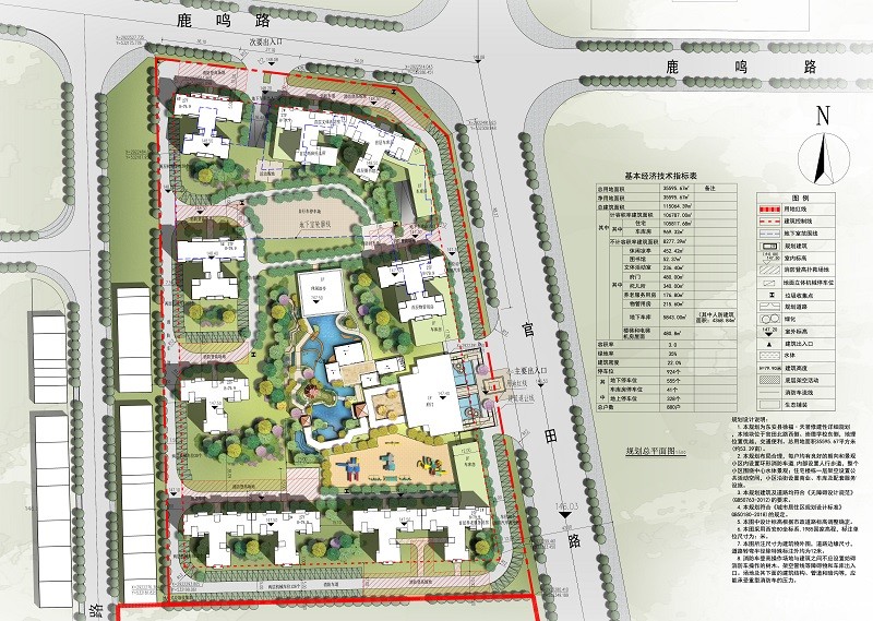 规划情况:该规划位于官田北路与鹿鸣路交汇处,鹿鸣路南侧,官田北路西侧。规划总平面内共计7栋高层住宅,建筑高度为79.9m,建筑层数为27F。规划主要经济技术指标:规划用地面积35595.67㎡(合约53.4亩),总建筑面积116327.8㎡(其中计容建筑面积106787㎡,不计容建筑面积9540.8㎡),不计容建筑面积包括地下车库6687.92㎡(人防建筑面积4368.84㎡),公共图书馆86.35㎡,文体活动室236.4㎡,养老服务设施192.5㎡,物管用房256.8㎡,托儿所440.4㎡,楼梯和电梯机房屋面513.9㎡。容积率3.0,建筑密度22%,绿地率35%,总户数907户,停车位952个(地面一层车位72个,地面两层机械车位281个、地下三层机械车位572个,车库28个)。