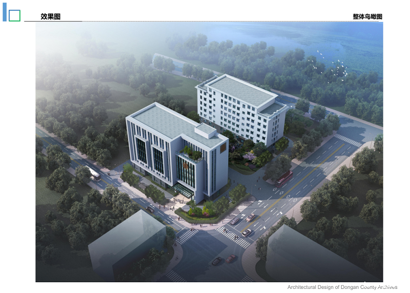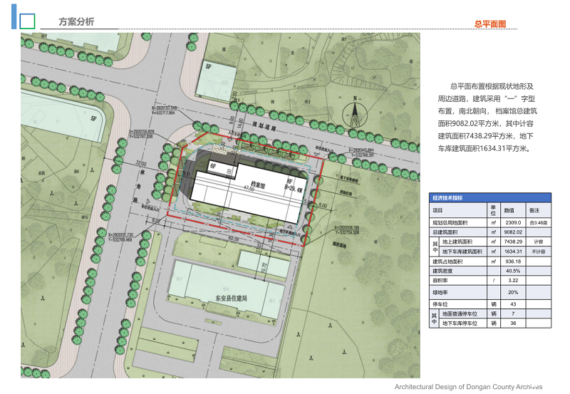 规划情况:该规划位于天成路东侧,县住建局北侧,该用地为县建设工程质量检测中心行政办公用地。规划总平面布置一栋6-8F档案馆,建筑高度29.4m,人行主出入口位于天成路与规划道路交汇处,地下车库出入口位于档案馆东南侧。规划主要经济技术指标:规划用地面积2309㎡(合约3.46亩),总建筑面积9082.02㎡(其中地上建筑面积7438.29㎡,地下建筑面积1634.31㎡),建筑基地面积936.18㎡,容积率3.22,建筑密度40.5%,绿地率20%,停车位43个(地上7个、地下36个)。
