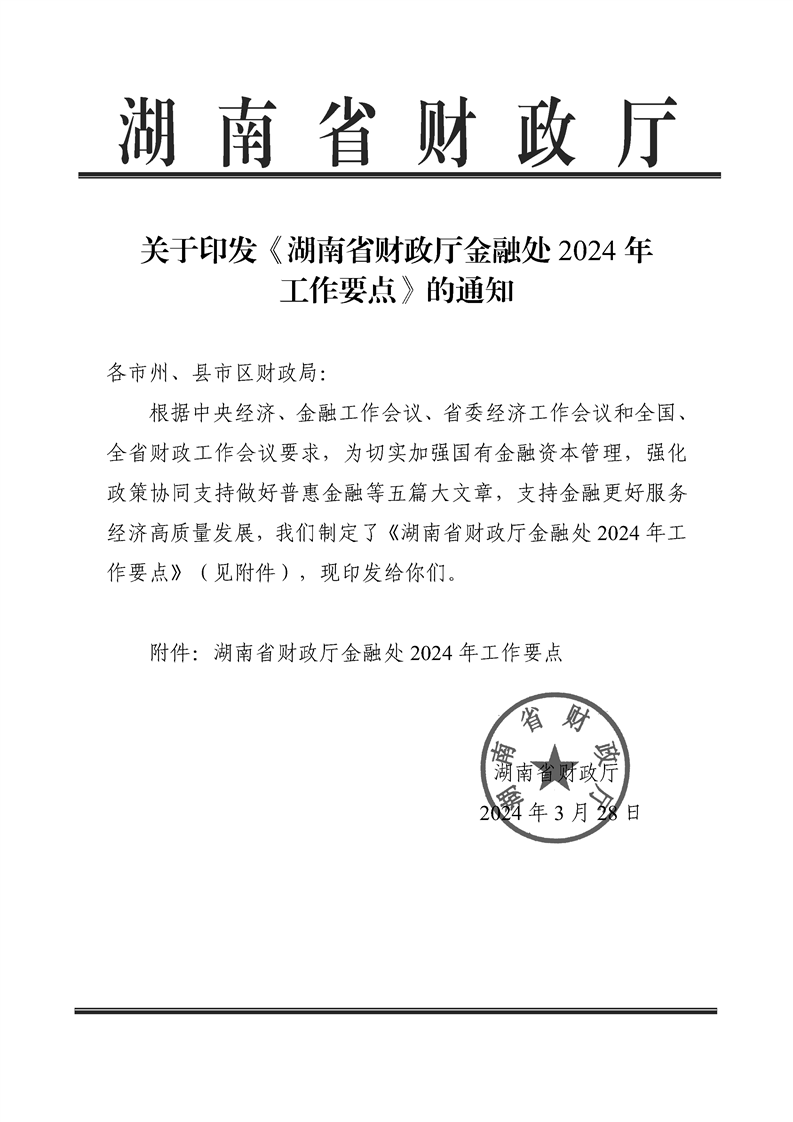 关于印发《湖南省财政厅金融处2024年工作要点》的通知