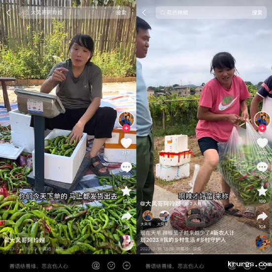 自2021年返乡从事电商创业以来,贺长虹、易红玲夫妻俩坚持通过镜头记录真实的乡村生活、分享推广当地的农特产品,运营的抖音账号“大风哥阿玲嫂”吸引了52万粉丝关注,是村里人人都知道的“农民网红”。今年7月,大风歌阿玲嫂家的辣椒、茄子迎来大丰收,抱着试一试的态度,他们将刚采摘的新鲜辣椒、茄子挂上“小黄车”,结果深受粉丝朋友青睐,一场直播下来一百多份茄子、辣椒一售而空,给了这对“80后”夫妻很大的惊喜。