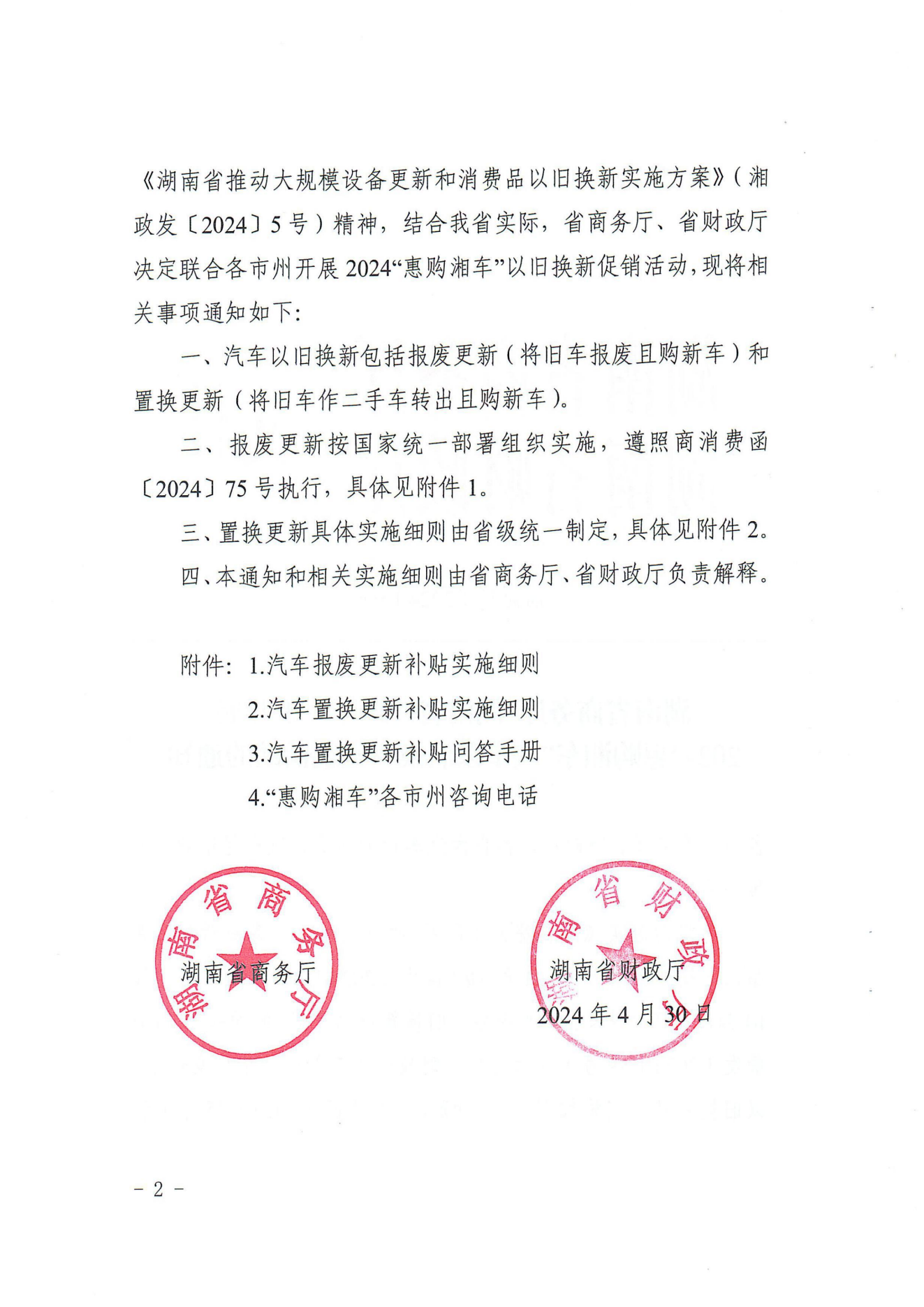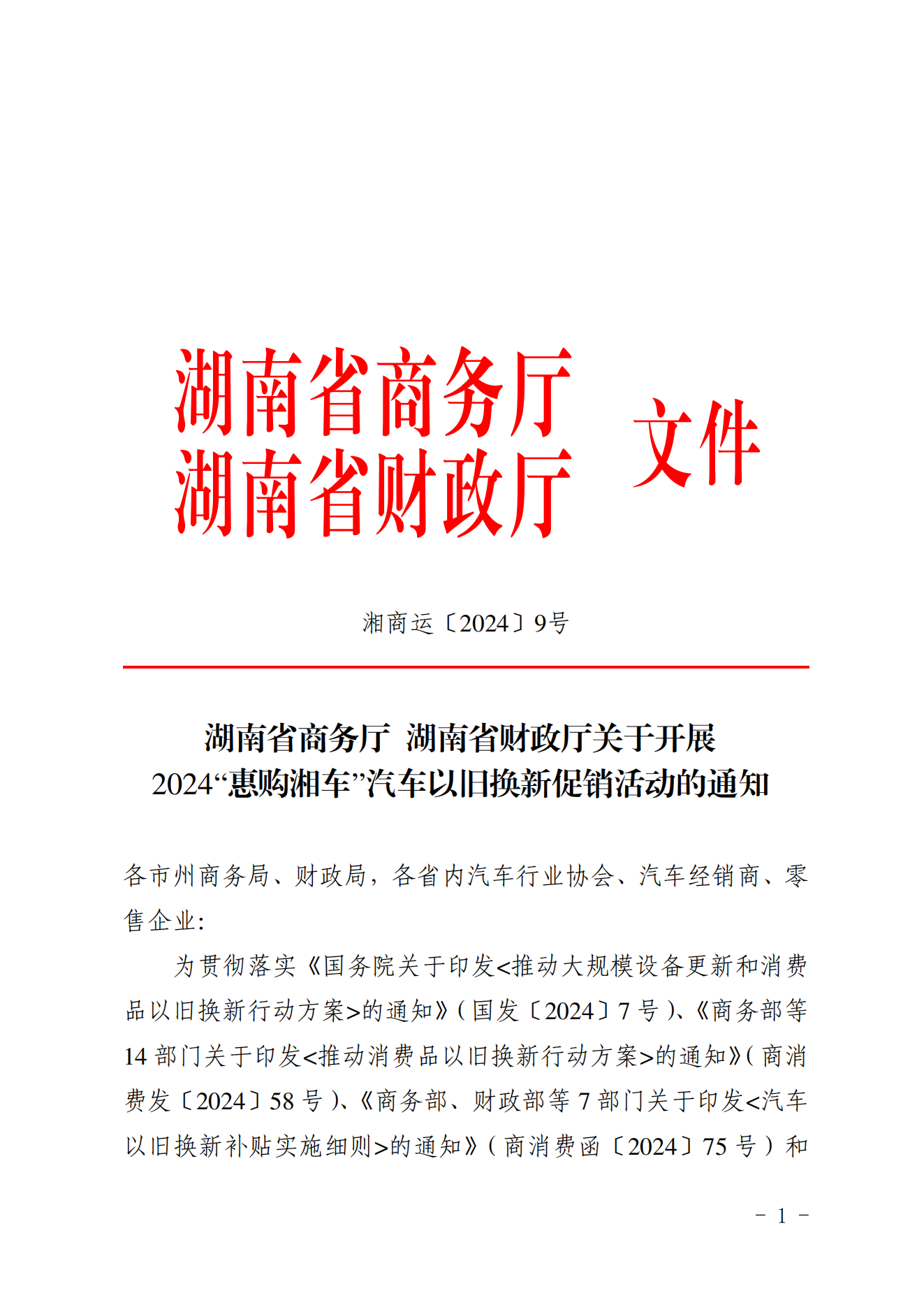 湖南省商务厅 湖南省财政厅关于开展2024“惠购湘车”汽车以旧换新促销活动的通知