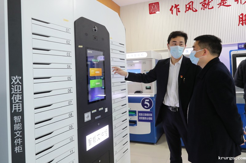 上海市闵行区七宝镇社区事务受理服务中心的工作人员(左)向前来办事的居民介绍智能文件柜的使用方法(2021年3月3日摄)。新华社记者 方喆 摄