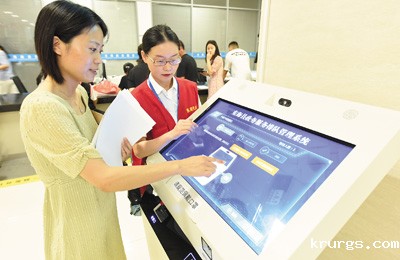 江苏东海县行政审批局工作人员在政务服务中心大厅自助服务终端指引市民办理业务。 |