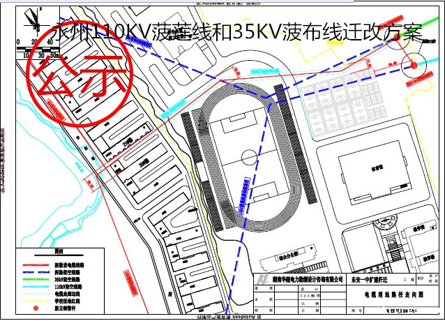 4、永州110KV菠莲线和35KV菠布线迁改方案。该线路为一中新校区原110KV菠莲线和35KV菠布线迁改工程,取消原两组穿越一中新校区110KV菠莲线和35KV菠布线,重新在一中新校区东北角设立两杆33米高杆塔,在校园内埋地敷设,35KV菠布线在西侧出校后沿学府路架空敷设,110KV菠莲线向南架空敷设。