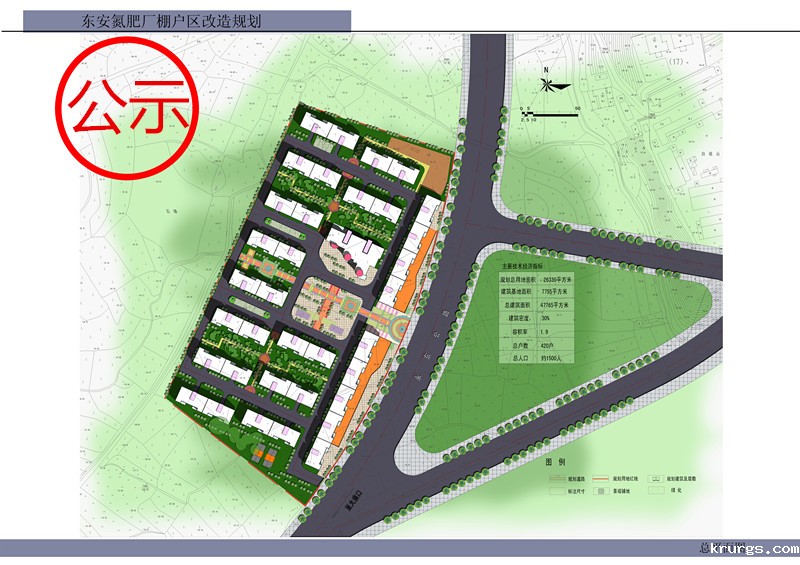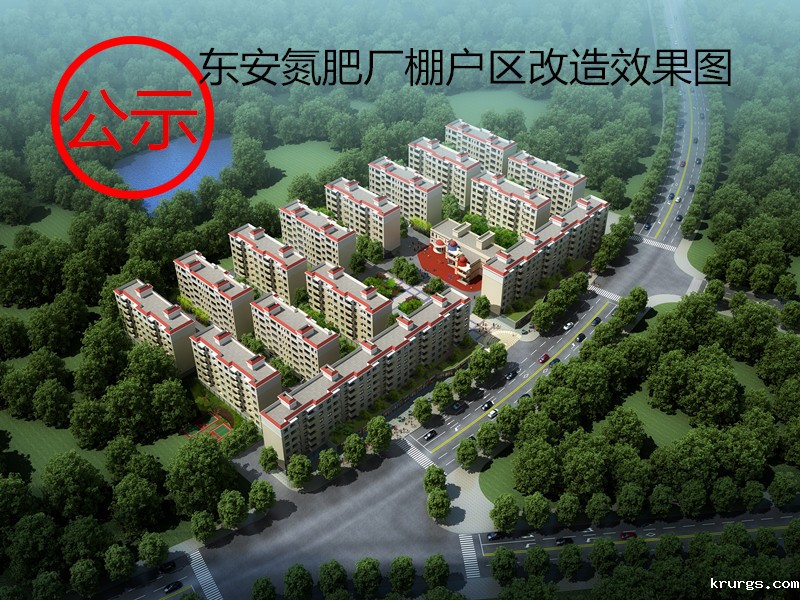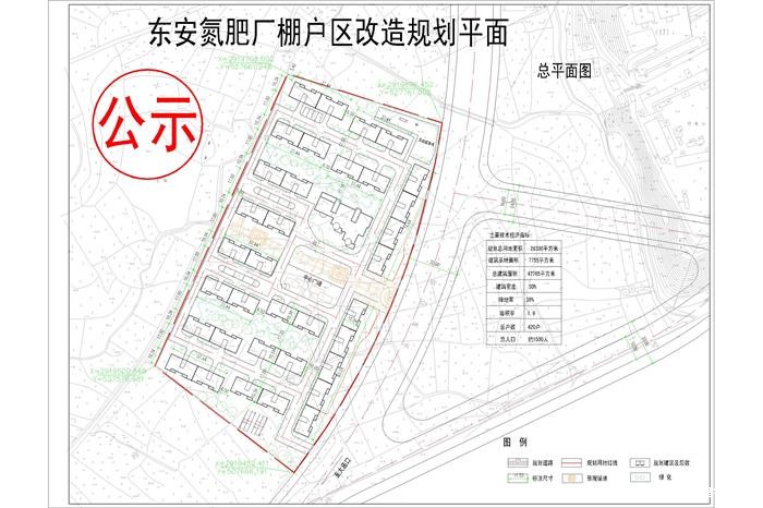 3、东安氮肥厂棚户区改造修建性详细规划。该规划位于永东公路二期西南侧,城西入城广场西侧,为东安氮肥厂棚户区改造安置房。规划总平面布置13栋1+6F住宅楼,2栋1+6F商住楼,一栋三层幼儿园。主要出入口设置在永东公路二期。规划主要经济技术指标:总用地面积26330㎡(合约39.49亩),总建筑面积47765㎡,建筑密度30 %,容积率1.9,绿地率30%, 总户数420户。