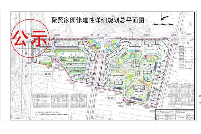 1、聚贤家园修建性详细规划。该规划位于狮岩路东侧,育才路南侧,由原四小片区B-01及B-04两宗地块组成。B-01地块平面规划为多层住宅楼,其中沿街均为7层商住楼,中间为四栋7层住宅楼,主要出入口设置在育才路。B-04地块沿街均为7层商住楼,沿育才路临街为1栋21层商住楼,中间为四栋21层高层住宅,主要出入口设置在育才路,两宗地块在中间四小道路以地下通道相连形成一个小区规划。规划主要经济技术指标:地块B-01总用地面积14054㎡(合约21.1亩),总建筑面积39907.26㎡,建筑密度41.92 %,容积率2.84,绿地率23.61%;地块B-01总用地面积25585㎡(合约38.4亩),总建筑面积104955.37㎡[地下建筑面积7604.64㎡,地上建筑面积97351.09㎡,建筑基地面积8249.48㎡],建筑密度32.24%,容积率3.80,绿地率42.54%。两宗地块合并计算主要规划经济技术指标为:总用地面积39639㎡(合约59.46亩),总建筑面积144862.99㎡[地下建筑面积7604.64㎡,地上建筑面积137258.35㎡,建筑基地面积14140.95㎡],建筑密度35.80 %,容积率3.462,绿地率35.80%,停车位435个(地下341个,地上94个), 总户数1230户。