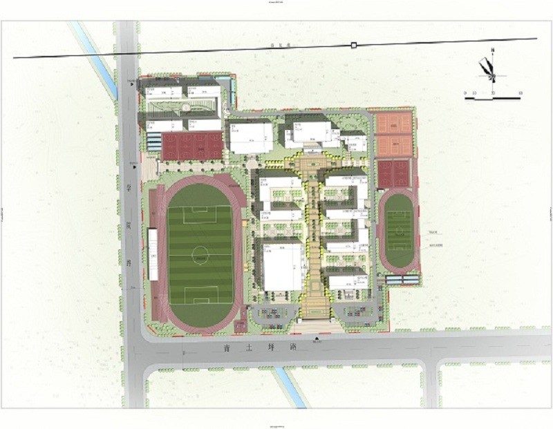 规划情况:该规划位于ray雷竞技官网入口城北部,青土坪路与学院路交汇处东北侧,为九年一贯制学校;规划总平面布置综合办公楼、体育馆、教学楼,图书馆、食堂及宿舍等,体育馆与办公楼的位置布置一处地下车库;规划占地面积74999.06㎡(合约112.4亩),学校规划设计小学部51班,中学部20班,约2000人小学,1000人中学;规划结构:“一心、两轴、五区”的空间结构,一心:以图书馆为核心的教学区;两轴:沿主入口自南向北直达校园图书馆形成礼仪形象主轴;东西向串联运动区与教学区功能景观轴;五区:办公区、公共教学区、教学区、运动区、生活区。公共教学区是图书馆大楼、公共教学楼;生活区是中学宿舍、小学宿舍、老师宿舍和食堂组成;教学办公区由中、小学教学楼,实验楼,体育馆、综合办公楼组成;运动区分布在教学办公区的东西两侧,中学400米6跑道,小学200米4跑道运动场配置有篮球场、排球场、乒乓球场、器械场地、升旗台等,室内运动场地主要分布在体育馆内。本项目主要经济技术指标见下表。