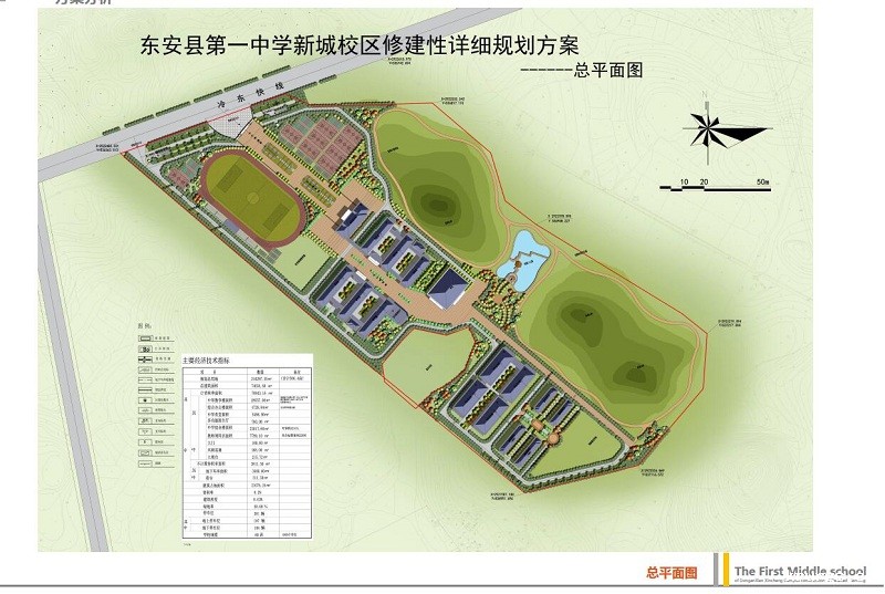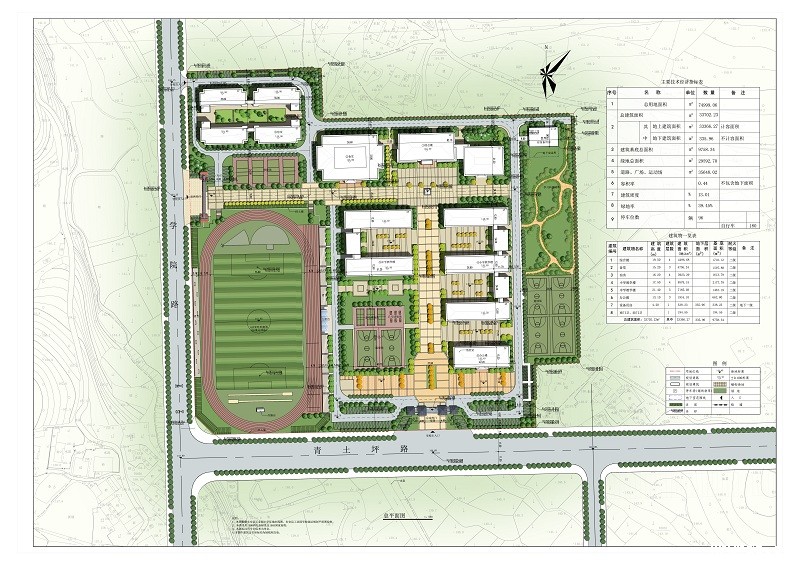 规划情况:该项目位于ray雷竞技官网入口东进路与冷东城际快线交汇处,冷东城际快线南侧,宥江桥村内。新校区总用地面积244297.35平方米(366.4亩),规划总建筑面积74654.66平方米,该规划设计高中部80个班,每班50人,共计4000人,六栋5层教学楼(含多功能报告厅),9个篮球场5个排球场及其他辅助教学设施, 400米田径运动场一个,四栋学生宿舍,可容纳3216寄宿生(按每间6人设置,寄宿生增加时可按每间10人设置),一栋食堂和四栋老师周转房以及 学校行政办公及科研用房一栋。规划采用人车分流,分为教学区、生活区、运动区三大功能区,规划布置一个主出入口和一个次出口,两个地下车库出入口,地下出入口位置位于地块北侧临近冷冻快线;布置六栋教学楼、一栋综合办公楼、一栋食堂、四栋学生宿舍楼、四栋教师周转房,体育馆为远期建设,建筑最大层数为五层,建筑最大高度为19.50m。规划主要经济技术指标:规划总用地面积244297.35㎡,总建筑面积74654.66㎡(其中计容建筑面积70843.16㎡,不计容建筑面积3811.50㎡),教学楼建筑面积28557.00㎡,综合办公楼建筑面积4728.84㎡,食堂建筑面积5496.90㎡,多功能报告厅建筑面积760.00㎡,学生宿舍建筑面积23017.60㎡,教师周转房建筑面积7799.10㎡,大门建筑面积100.00㎡,风雨连廊建筑面积168.00㎡,主席台建筑面积215.72㎡,地下车库建筑面积3500.00㎡,看台建筑面积311.50㎡。容积率0.29,建筑密度8.63%,绿地率50%,停车位301个(其中地上197个,地下104个),学校规模80个班。规划主要经济技术指标见下表: