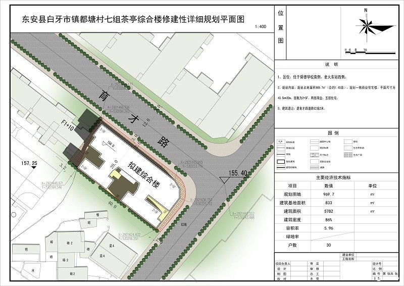 规划情况:该规划位于老火车站西南侧。该规划总平面图布置1栋2+5F商住楼,建筑高度21.4m。该规划主要经济技术指标:规划用地面积969.7㎡(合约1.45亩),总建筑面积5782㎡(其中计容建筑面积5782㎡),住宅建筑面积5876.59㎡,商业建筑面积1666㎡,绿地率0%,建筑密度86%,容积率5.96,户数30户。