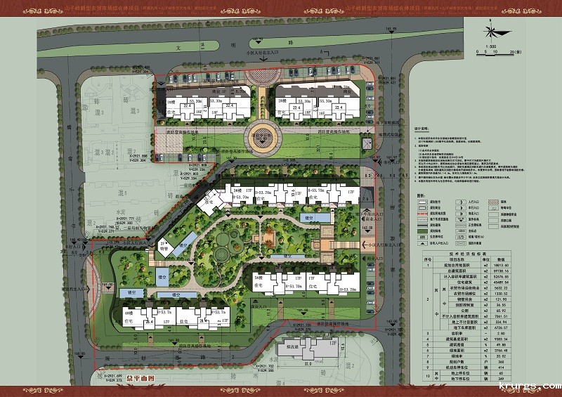 规划情况:该规划位于文明路与山子岭路交汇处,文明路以南,山子岭路东侧,规划总平面布置两个地下车库出入口,两个车行出入口和两个人行出入口。北侧布置2栋1+17F商住楼,南侧布置3栋1+17F商住楼,底层为农贸市场。该规划主要经济技术指标:规划用地面积18813.6㎡(合约28.22亩),总建筑面积59738.16㎡(其中计容建筑面积52676.65㎡,不计容建筑面积7061.51㎡),住宅建筑面积45489.54㎡,农贸市场沿街商业5632.22㎡,农贸市场摊位1330.52㎡,物管用房121.90㎡,消防控制室36.55㎡,公厕65.92㎡,绿地率20.01%,建筑密49.88%,容积率2.8,户数360户,停车位414个(其中地上停车位65个,地下停车位349个)。