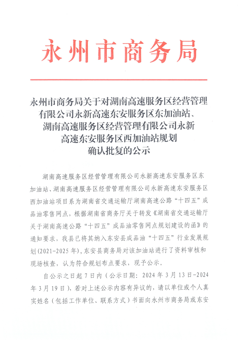 永州市商务局关于对湖南高速服务区经营管理有限公司永新高速东安服务区东加油站、湖南高速服务区经营管理有限公司永新高速东安服务区西加油站规划确认批复的公示