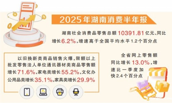 今年上半年,湖南社会消费品零售总额10391.81亿元、同比增长6.2%,增速高于全国平均水平1.2个百分点。