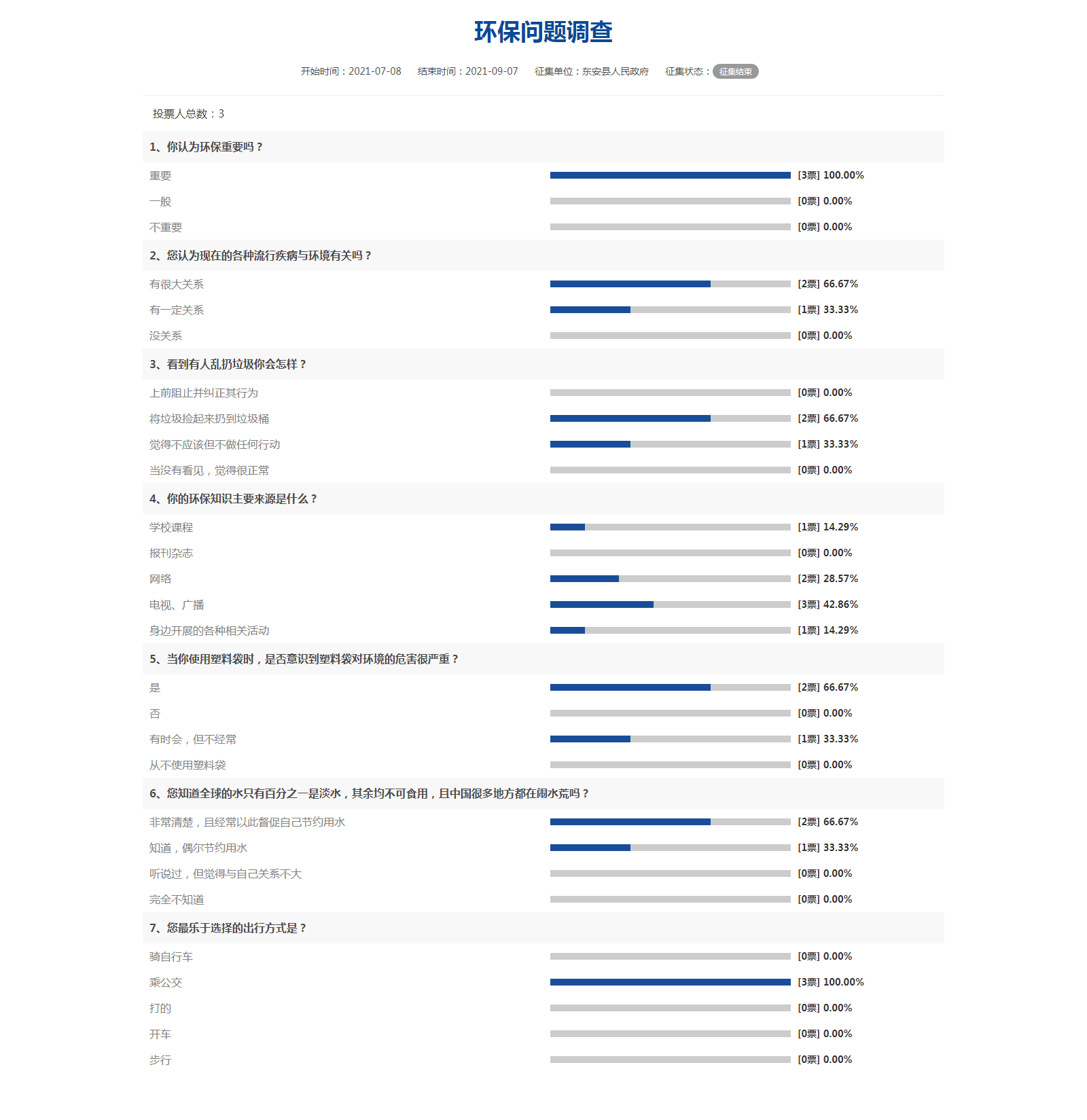 rayvet雷竞技于2021年7月8日至2021年9月7日展开了“环保问题调查”的网上问卷调查,共收到3份调查结果,现将结果反馈如下: