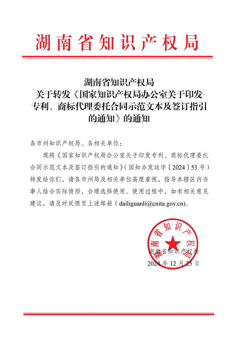 湖南省知识产权局关于转发《国家知识产权局办公室关于印发专利、商标代理委托合同示范文本及签订指引的通知》的通知