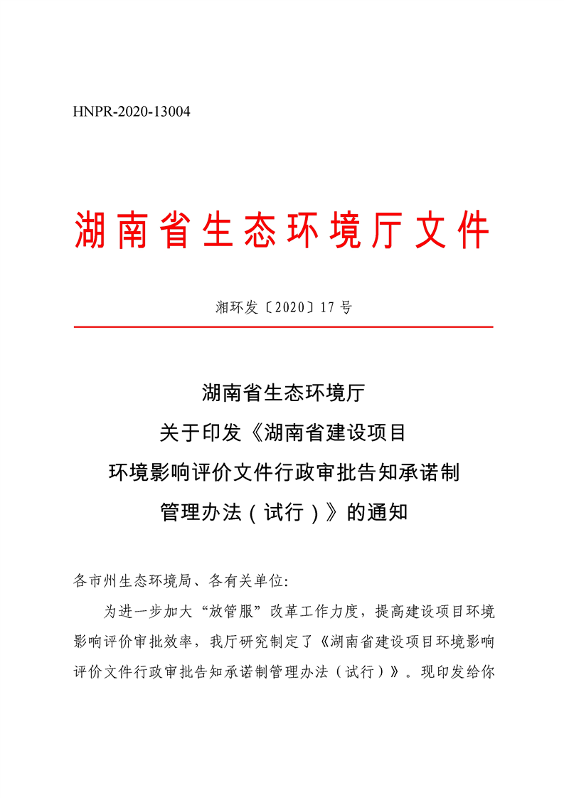关于印发《湖南省建设项目环境影响评价文件行政审批告知承诺制管理办法(试行)》的通知