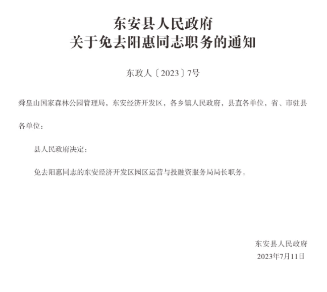 rayvet雷竞技关于免去阳惠同志职务的通知