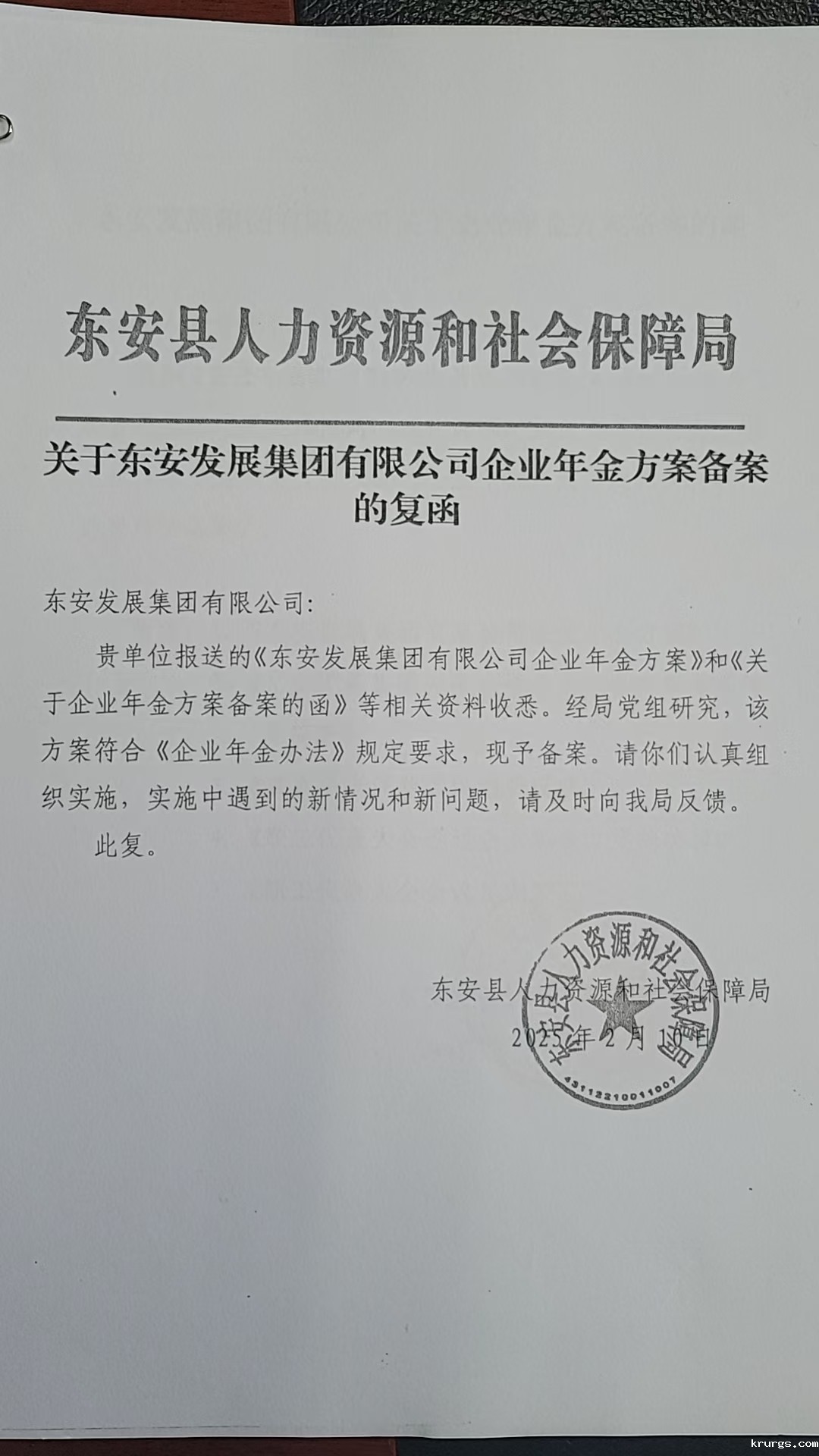关于东安发展集团有限公司企业年金方案备案的复函