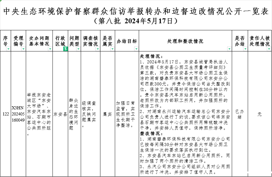 截至2024年5月26日,对中央第五生态环境保护督察组向ray雷竞技官网入口移交的第八批群众信访举报件1件(其中重点件0件),相关县直部门和相关乡镇均按要求进行了调查处理,详见中央生态环境保护督察群众信访举报转办和边督边改公开情况一览表(第八批)。