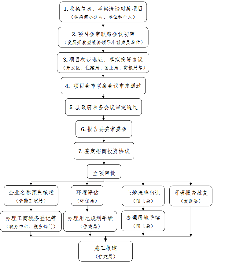 五、招商项目报告县委常委会议。县商务和粮食局在县委常委会议上汇报县政府常务会议审定通过的招商引资项目。县商务和粮食局将会议结果反馈给投资方,完成第五步对接工作。