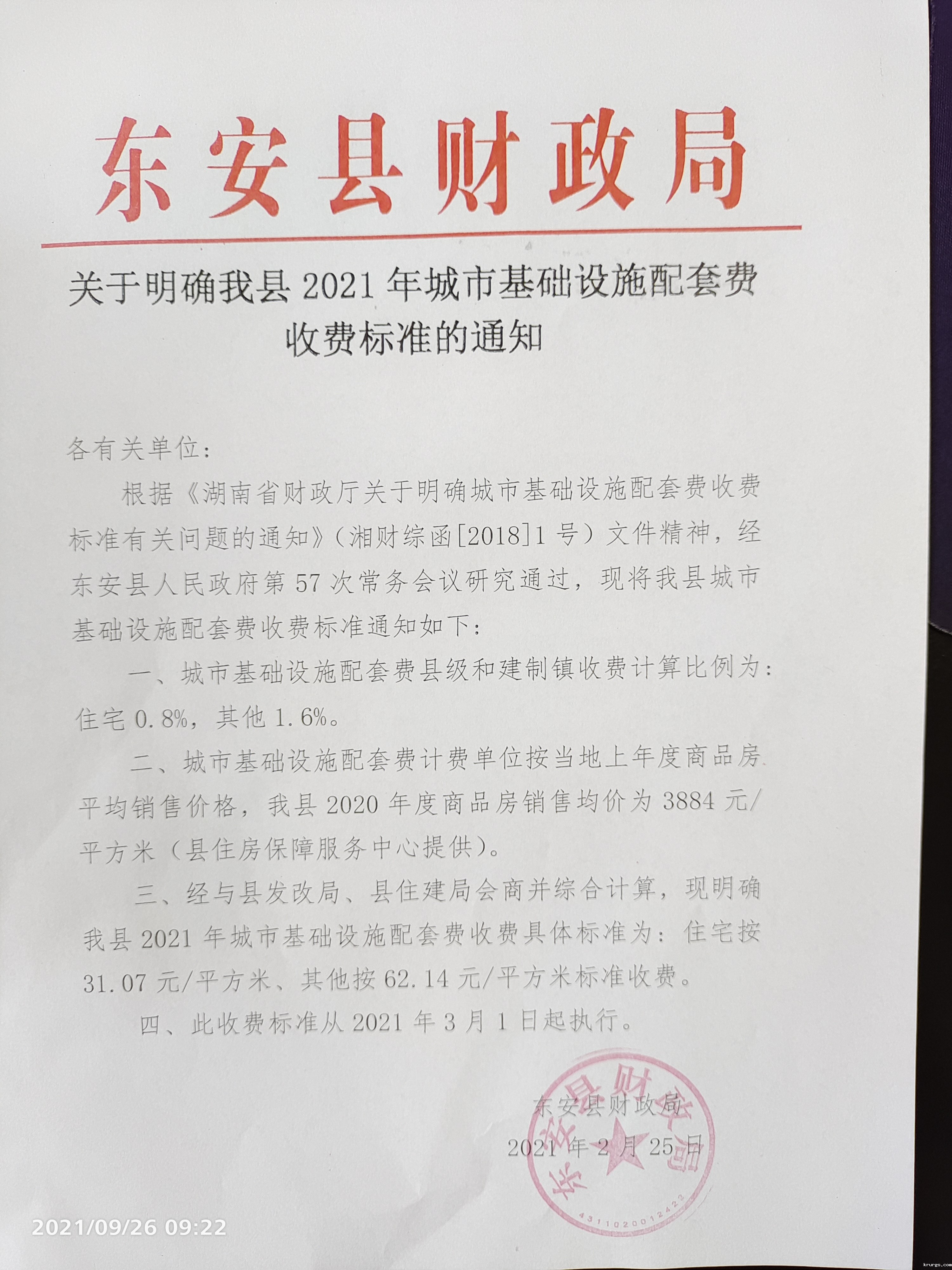 关于明确我县2021年城市基础设施配套费收费标准的通知