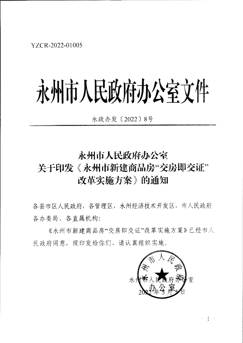 永州市人民政府办公室关于印发《永州市新建商品房“交房即交证”改革实施方案》的通知