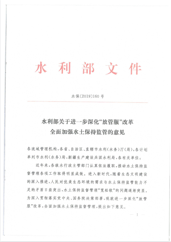 水利部关于进一步深化“放管服”改革全面加强水土保持监管的意见(水保〔2019〕160号)