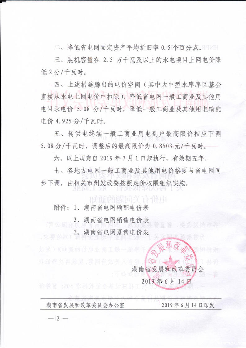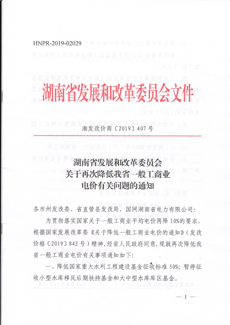 湘发改价商〔2019〕407号 关于再次降低我省一般工商业电价有关问题的通知