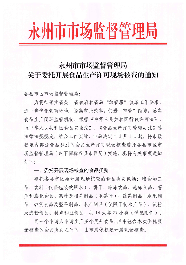 永州市市场监督管理局关于委托开展食品生产许可现场核查的通知