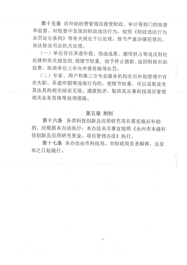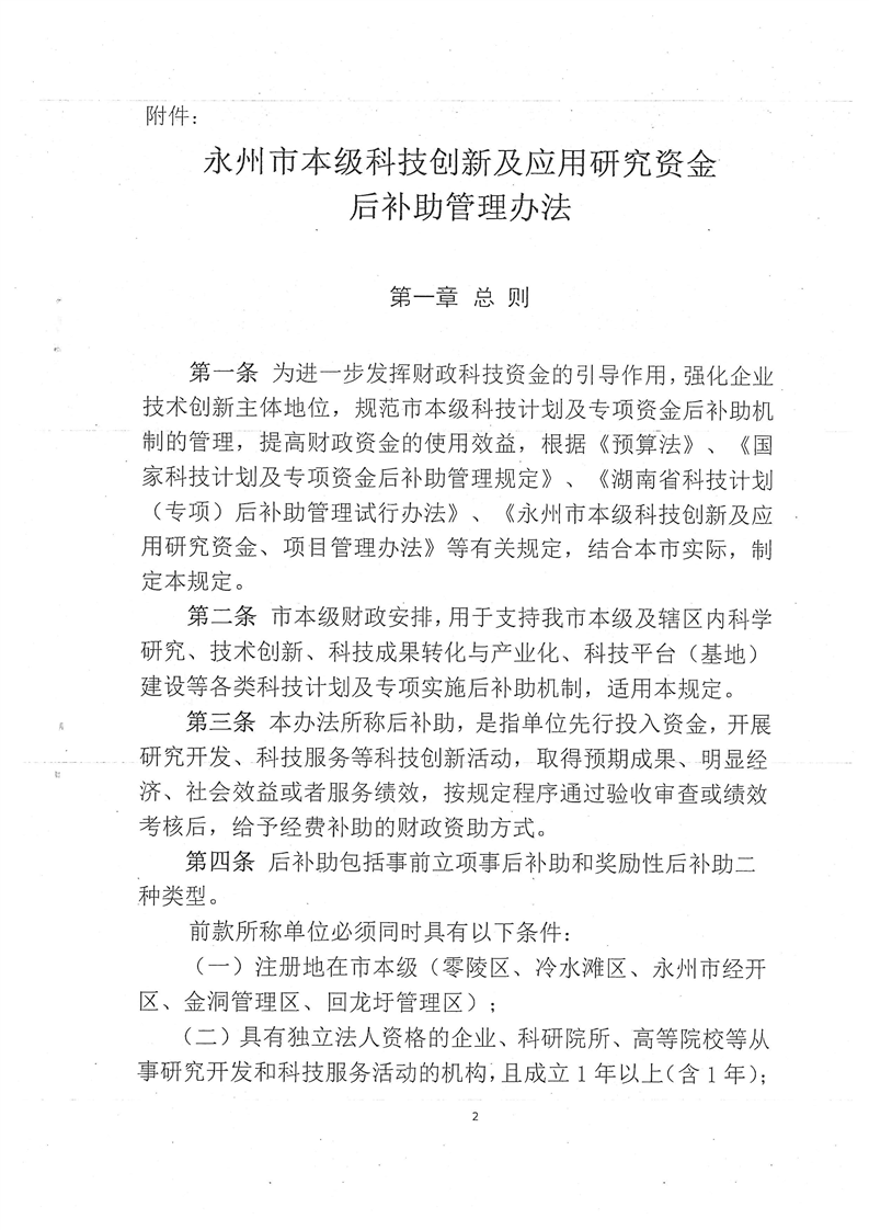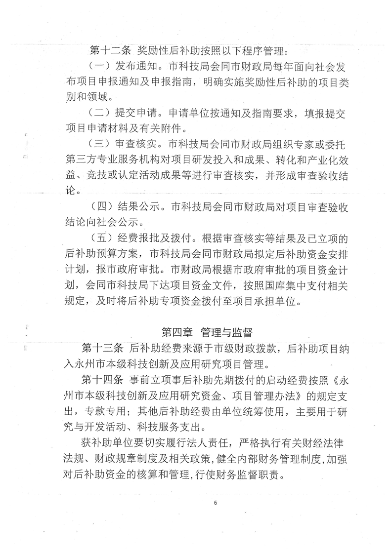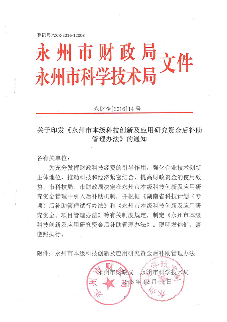 关于印发《永州市本级科技创新及应用研究资金后补助管理办法》的通知