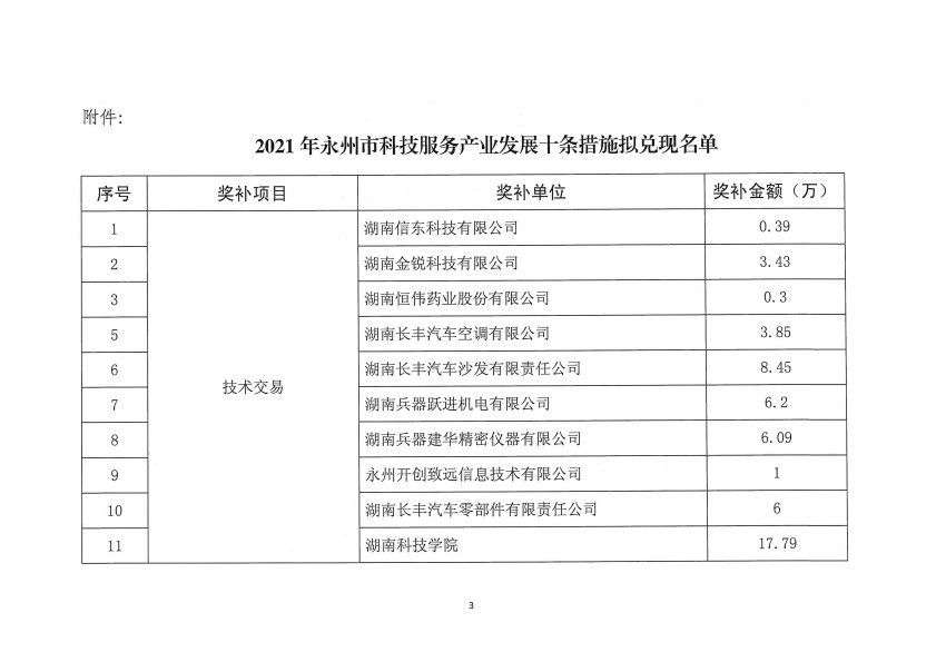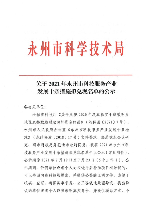 永州市2021年科技服务产业发展十条措施拟兑现名单