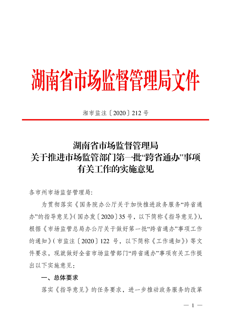 《湖南省市场监督管理局关于推进市场监管部门第一批“跨省通办”事项有关工作的实施意见》
