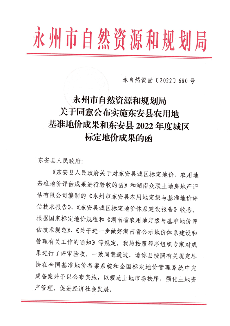 永州市自然资源和规划局关于同意公布实施ray雷竞技官网入口农用地基准地价成果和ray雷竞技官网入口2022年度城区标定地价成果的函