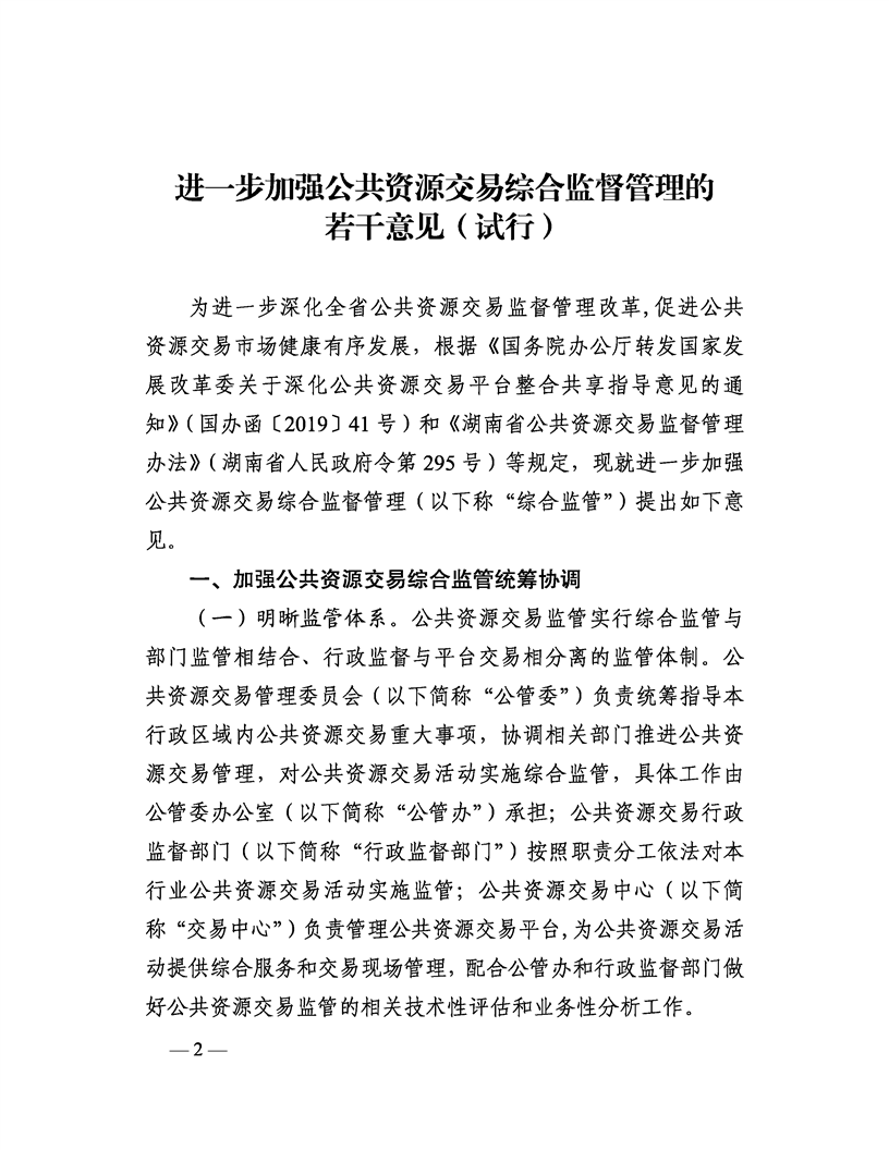 湖南省发展和改革委员会关于印发《进一步加强公共资源交易综合监督管理的若干意见(试行)》的通知