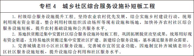 将综合服务设施建设纳入国土空间规划,推进新建社区综合服务设施标准化规范化建设,确保新建社区商业和综合服务设施面积达标。实施城乡社区综合服务设施补短板工程,鼓励通过换购、划拨、租借等方式,统筹利用社区各类存量房屋资源增设服务设施。有条件的地方可通过租赁住宅楼底层商业用房等其他符合条件的房屋开展社区服务。鼓励有条件的地方开展城市社区综合服务体建设,促进便民利民服务集聚集群发展、项目化系统化供给。建设智能快件箱(信包箱)和邮政快递末端综合服务站等配套设施。实施村级综合服务设施提升工程,完善村级综合服务设施网络,推进标准化建设。统筹利用益农信息社等村级服务站点,增强村级综合服务功能。加快建设易地扶贫搬迁集中安置社区综合服务设施,确保2025年实现综合服务设施全覆盖。按照老年人、未成年人、残疾人优先的原则,优化社区综合服务设施空间布局,促进各类服务设施功能差异互补、内容衔接配套。推动社区卫生服务中心与社区养老服务机构毗邻建设,推进社区设施适老化、适儿化改造和无障碍建设。精简整合办公空间推行开放式办公,增加居民活动区域面积。农村要合理规划群众举办红白喜事等活动的公共场所,统筹考虑布局公益性安葬服务设施。