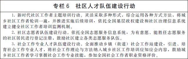 组织实施社区人才队伍建设行动。规范村(居)民委员会换届选举,全面落实村(社区)“两委”班子成员资格联审机制。建立健全村(社区)党组织书记后备人才库,依法选优配强村(社区)“两委”班子成员。综合考虑服务居民数量等因素,合理确定社区工作者配备标准。通过选派、聘用、招考等方式,选拔优秀人才充实社区工作者队伍。健全社区工作者职业体系,建立岗位薪酬制度并完善动态调整和职业成长机制,按规定参加社会保险并享受相应待遇。鼓励高校毕业生、退役军人到村(社区)就业创业。
