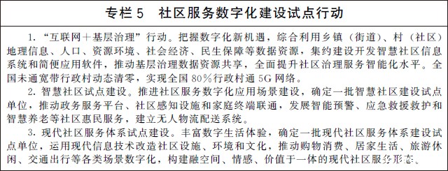 开发社区协商议事、政务服务办理、养老、家政、卫生、托育等网上服务项目应用,推动社区物业设备设施、安防等智能化改造升级。集约建设智慧社区信息系统,开发智慧社区移动应用服务,加速线上线下融合。推进数字社区服务圈、智慧家庭建设,促进社区家庭联动智慧服务生活圈发展。大力发展社区电子商务,探索推动无人物流配送进社区。推动“互联网+”与社区服务的深度融合,逐步构建服务便捷、管理精细、设施智能、环境宜居、私密安全的智慧社区。以县(市、区、旗)为单位,支持利用互联网、物联网、区块链等现代信息技术,深入组织开展智慧社区、现代社区服务体系试点建设,高效匹配社区全生活链供需,扩大多层次便利化社会服务供给。鼓励社会资本投资建设智慧社区,运用第五代移动通信(5G)、物联网等现代信息技术推进智慧社区信息基础设施建设。