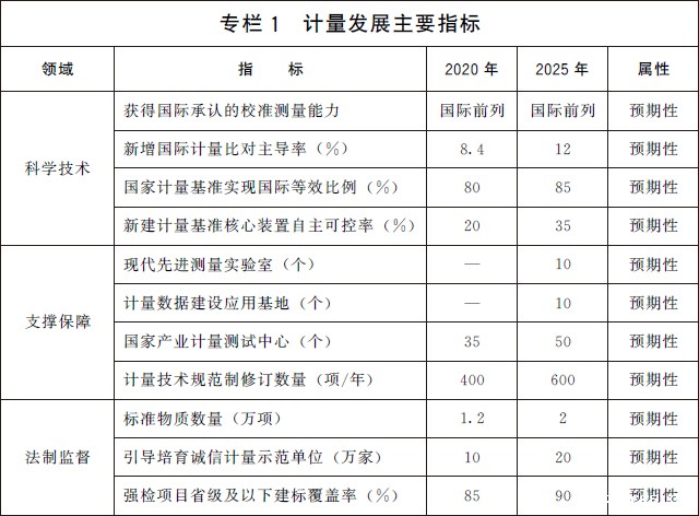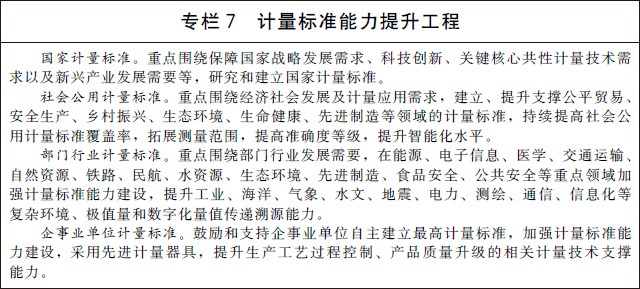 计量是实现单位统一、保证量值准确可靠的活动,是科技创新、产业发展、国防建设、民生保障的重要基础,是构建一体化国家战略体系和能力的重要支撑。为贯彻落实《中华人民共和国国民经济和社会发展第十四个五年规划和2035年远景目标纲要》,进一步夯实计量基础,提升计量能力和水平,全面开启计量事业发展新征程,推动经济社会高质量发展,制定本规划。 一、编制背景 党的十八大以来,在以习近平同志为核心的党中央坚强领导下,我国计量事业得到快速发展。基础性、前沿性和共性计量科研成果大量涌现,建成185项国家计量基准和6.2万余项社会公用计量标准,标准物质供给数量持续增长,量值传递溯源体系更加完善,获得国际承认的校准测量能力达1779项,位居世界前列,我国成为全球有能力参与驾驭国际原子时的8个国家之一。计量监管体系不断健全,全社会计量意识日益增强,计量在国民经济社会发展中的作用更加凸显。 2018年国际单位制基本单位全面采用物理常数定义,国际测量技术规则与格局将予重构,由此带来的影响广泛而深远。随着经济社会的快速发展,各领域对精准测量测试的需求与计量供给不充分、不平衡、不全面之间的矛盾日益突出,部分领域量值传递溯源能力还存在空白,关键计量测试技术有待突破,计量监管思路和模式有待进一步创新,计量社会共治亟需加强。实施计量优先发展战略,加强计量基础研究,强化计量应用支撑,提升国家整体计量能力和水平已成为提高国家科技创新能力、促进经济社会高质量发展的必然要求。 二、总体要求 (一)指导思想。以习近平新时代中国特色社会主义思想为指导,全面贯彻落实党的十九大和十九届历次全会精神,紧紧围绕统筹推进“五位一体”总体布局和协调推进“四个全面”战略布局,以推动高质量发展为主题,统筹发展和安全,以国家重大需求为牵引,以重大技术突破为主攻方向,充分调动社会各方资源和力量,加强计量顶层制度设计,加快构建国家现代先进测量体系,为引领科学技术进步、促进经济社会高质量发展提供强有力的计量基础支撑和保障。 (二)基本原则。 坚持创新突破、改革引领。面向世界科技前沿和国家重大需求,大力加强计量科技创新,加大基础、前沿和应用领域计量薄弱环节技术研究,推动计量产学研协同创新。探索建立新型计量监管模式和思路,推动计量制度改革,提升计量管理能力和水平。 坚持需求牵引、供给提升。面向经济主战场和重大民生需求,围绕计量供给不充分、不平衡、不全面的问题,加强计量基础能力建设,强化计量服务支撑,提升计量自主可控能力和水平,培育计量新业态、发展计量新模式,形成需求牵引供给、供给创造需求的计量发展新机制。 坚持政府统筹、市场驱动。突出计量战略资源地位,加强政府对计量事业发展的全局性谋划、战略性布局、整体性推进。充分发挥市场在资源配置中的决定性作用,强化市场主体地位,培育计量校准、测试等高技术服务业,规范各类市场计量行为,促进市场健康有序发展。 坚持协同融合、开放共享。充分调动各方资源和积极性,着力完善横向协同、纵向贯通的计量工作协调推进机制,形成全社会共建、共治、共享的计量发展新格局。加强国际交流,促进开放合作,推进计量基础设施互联互通。 (三)发展目标。到2025年,国家现代先进测量体系初步建立,计量科技创新力、影响力进入世界前列,部分领域达到国际领先水平。计量在经济社会各领域的地位和作用日益凸显,协同推进计量工作的体制机制进一步完善。 计量科学技术水平不断提升。加强量子计量、量值传递扁平化和计量数字化转型技术研究,建立国际一流的新一代国家计量基准,攻克一批关键计量测试技术,研制一批具有原创性成果的计量标准装置、仪器仪表和标准物质,建设一批国家计量科技创新基地和先进测量实验室,培养造就一批具有国际影响力的计量科研团队和计量专家队伍,确保国家校准测量能力处于世界先进水平。 计量服务保障能力持续增强。计量在国家重大战略中的基础支撑和保障作用更加突出,计量测试服务能力基本覆盖重要产业发展领域。在战略性新兴产业、现代服务业等重点领域建立一批国家产业计量测试中心,研制一批专用计量测试设备,形成一批专用计量测试方法和标准规范,计量服务经济社会各领域高质量发展体系日趋完善。 计量监督管理体制逐步完善。推动计量法和配套法规规章的制修订,构建适应时代发展的法律法规体系。充分运用大数据、区块链、人工智能等现代技术,探索建立新型计量监管模式和制度,推动监管重点从管器具向管数据、管行为、管结果的全链条计量监管体制转变。社会各方计量溯源性意识得到明显增强,开放共享的计量协同发展机制基本建立并不断完善。 展望到2035年,国家计量科技创新水平大幅提升,关键领域计量技术取得重大突破,综合实力跻身世界前列。建成以量子计量为核心、科技水平一流、符合时代发展需求和国际化发展潮流的国家现代先进测量体系。