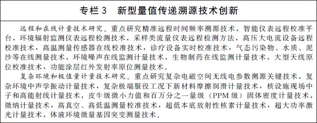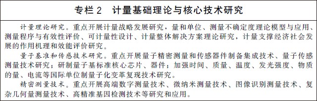 三、加强计量基础研究,推动创新驱动发展 (四)加强计量基础和前沿技术研究。加强计量学基础理论和核心技术的原始创新。实施“量子度量衡”计划,重点研究基于量子效应和物理常数的量子计量技术及计量基准、标准装置小型化技术,突破量子传感和芯片级计量标准技术,形成核心器件研制能力。研究人工智能、生物技术、新材料、新能源、先进制造和新一代信息技术等领域精密测量技术。开展测量不确定度、测量程序与有效性评价、计量作用机理和效能评价等理论研究。