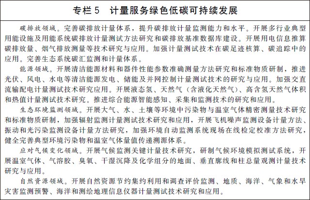 (十)服务高端仪器发展和精密制造。加强高端仪器设备核心器件、核心算法和核心溯源技术研究,推动关键计量测试设备国产化。推动量子芯片、物联网、区块链、人工智能等新技术在计量仪器设备中的应用。加强高精度计量基准、标准器具的研制和应用,提升计量基准、标准关键核心设备自主可控率。加强色谱仪、质谱仪、扫描电子显微镜、高精度原子重力仪等高端通用仪器设备研制,加快面向智能制造、环境监测、国防等领域专用计量仪器仪表的研制和推广使用。加快量子传感器、太赫兹传感器、高端图像传感器、高速光电传感器等传感器的研制和应用。实施仪器设备质量提升工程,强化计量在仪器设备研发、设计、试验、生产和使用中的基础保障作用。建立仪器仪表计量测试评价制度。建立仪器仪表产业发展集聚区,培育具有核心技术和核心竞争力的国产仪器仪表品牌。 (十一)提升航空、航天和海洋领域计量保障能力。建立完善航空、航天、海洋等领域计量保证与监督体系,加强产品型号总计量师系统建设。推动航空装备计量数字化、体系化发展,健全全产业链、全寿命周期计量评价体系,为航空装备发展提供一体化计量测试技术支撑。研究建立空间计量技术体系,提升空间领域计量保障能力和航天装备质量控制水平,补齐关键、特色参数指标计量测试能力短板。开展海上卫星导航设备、海洋装备测量测试技术研究,提升海洋装备数字化测量能力。健全海洋立体观测、生态预警、深海气候变化、生物多样性监测等领域计量保障体系。 (十二)服务人工智能与智能制造发展。加强人工智能计量基础理论、评估方法和技术研究,开发用于评测人工智能系统性能的参考数据集。研究智能基础设施计量测试技术,形成各领域通用的人工智能计量体系框架、接口与方法、标准规范。开展工业机器人机械系统、控制系统、驱动系统等关键计量测试技术研究,提升智能工业控制系统整体测量性能。建立适用于智能制造、智能交通、智能安防等领域的智能水平评价标准和计量测试平台,提升数据和知识协同驱动的计量测试能力。 (十三)服务数字中国建设。加强计量与现代数字技术、网络技术以及产业数字化科研生产平台联动。针对工业先进制造,加快基于协调世界时(UTC)的分布式可靠时间同步技术、时空敏感网络、传感器动态校准等数字计量设施建设。以量值为核心,提升数字终端产品、智能终端产品计量溯源能力。开展智能传感器、微机电系统(MEMS)传感器等关键参数计量测试技术研究,提升物联网感知装备质量水平,打造全频域、全时段、全要素的计量支撑能力。 (十四)支撑碳达峰碳中和目标实现。完善温室气体排放计量监测体系,加强碳排放关键计量测试技术研究和应用,健全碳计量标准装置,为温室气体排放可测量、可报告、可核查提供计量支撑。建立碳排放计量审查制度,强化重点排放单位的碳计量要求。在城市和园区开展低碳计量试点。建立完善资源环境计量体系,建设一批国家能源、水文水资源和环境计量中心,推进能耗、水资源、环境监测系统建设,加强能源资源和环境计量数据分析挖掘和利用。加快推进能源资源计量服务示范工程建设,引导和培育能源资源和环境计量服务市场。