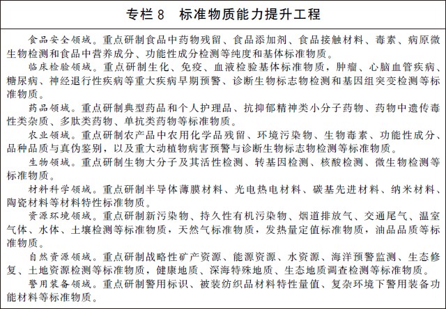 (二十)加大标准物质研制应用。建立完善以国家基准物质、国家标准物质和工作标准物质为主要组成部分的标准物质体系。实施标准物质能力提升工程,加快生命科学、生物医药、环境监测、食品安全、自然资源、刑事司法等重点领域的标准物质研制和应用。加强标准物质监管能力建设和关键共性技术研究,提升标准物质不确定度水平。探索建立标准物质质量追溯制度,建设一批标准物质量值核查验证实验室,建立标准物质质量追溯平台,形成研发、生产、应用全寿命周期的监管能力。