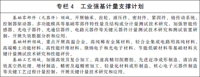 (七)加强关键共性计量技术研究。加快开展量热技术、数字化模拟测量技术、工况环境监测技术等基础共性计量技术研究。加强智能化计量校准技术研究,开展计量软件功能安全测评等关键技术研究和应用。加强高精度、集成化、微型化、智能化的新型传感技术研究,攻克高端计量测试仪器设备核心关键部件和技术。建立有利于计量新技术、新方法向产业转移的服务平台。 (八)构建良好计量科技创新生态。强化国家级科研机构导向作用,发挥综合性、行业性科研院所引领作用,建设一批高水平先进计量基础设施,打造突破型、引领型、平台型的先进计量测试实验室。充分发挥企业、科研院所和高校等计量优势资源力量,建立一批计量科技创新基地。加大产学研用计量科技合作,推动计量科技成果转化应用,构建计量、质量、标准、知识产权等融合联动的计量科技成果转化服务体系。 四、强化计量应用,服务重点领域发展 (九)支撑先进制造与质量提升。实施制造业计量能力提升工程,建立一批先进制造业发展急需的高准确度、高稳定性计量基准、标准。在战略性新兴产业和现代服务业等领域,建设一批国家产业计量测试中心和联盟,搭建计量公共服务平台,聚焦制造业领域测不了、测不全、测不准难题,加强关键计量测试技术、测量方法研究和装备研制,为产业发展提供全溯源链、全产业链、全寿命周期并具有前瞻性的计量测试服务。开展产业计量基础能力提升行动,实施工业强基计量支撑计划,充分发挥计量对基础零部件(元器件)、基础材料、基础工艺的技术支撑和保障作用。研究建立国家工业计量基础数据库,加强工业制造领域计量检定、校准、测试和检测数据的采集、管理和应用。