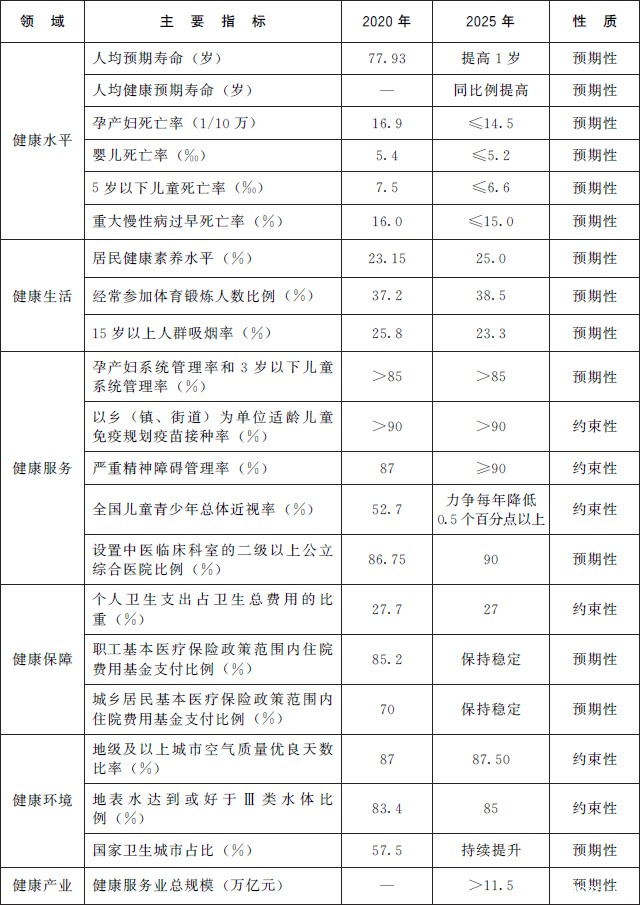 (三)发展目标。到2025年,卫生健康体系更加完善,中国特色基本医疗卫生制度逐步健全,重大疫情和突发公共卫生事件防控应对能力显著提升,中医药独特优势进一步发挥,健康科技创新能力明显增强,人均预期寿命在2020年基础上继续提高1岁左右,人均健康预期寿命同比例提高。