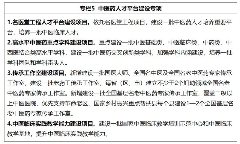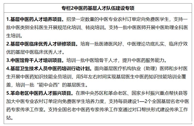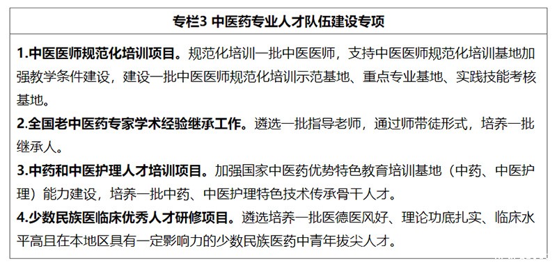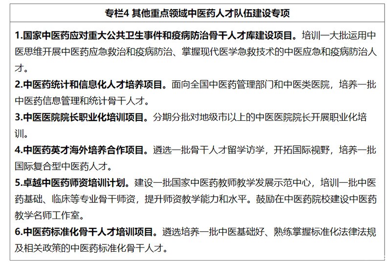 (一)培养中医药急需紧缺人才。依托国家中医疫病防治基地、中医紧急医学救援基地,打造中医疫病防治队伍和紧急医学救援队伍。持续推进中医药应对重大公共卫生事件和中医疫病防治骨干人才库建设。鼓励高等院校和科研院所等开展中医药宏观战略政策研究。服务中医药综合统计制度和信息化建设,加强中医药统计和信息化人员配备,实施中医药统计和信息化人才培养项目。