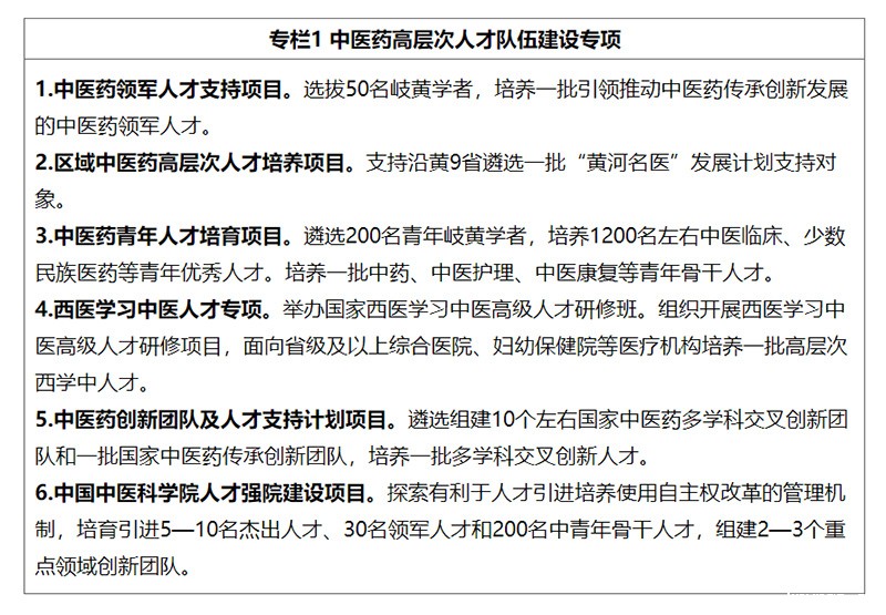 (二)培育中医药青年拔尖人才。在中医药高层次人才培养计划中设立青年专项。在国家中医药重点建设项目、重大科技立项等项目中支持中医临床优秀人才、青年岐黄学者等青年拔尖人才挑大梁、当主角。加大中医临床等骨干人才培养项目实施力度,扩大项目规模,加强青年人才培养。建立健全对青年人才的普惠性支持措施,改善青年人才成长环境,促进中医药青年人才快速成长。