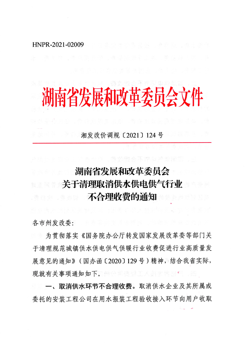 现将湖南省发展和改革委员会《关于清理取消供水供电供气行业不合理收费的通知》(湘发改价调规[2021]124号)转发给你们,请严格遵照执行。