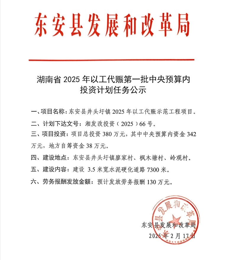 湖南省2025年以工代赈第一批中央预算内投资计划任务公示