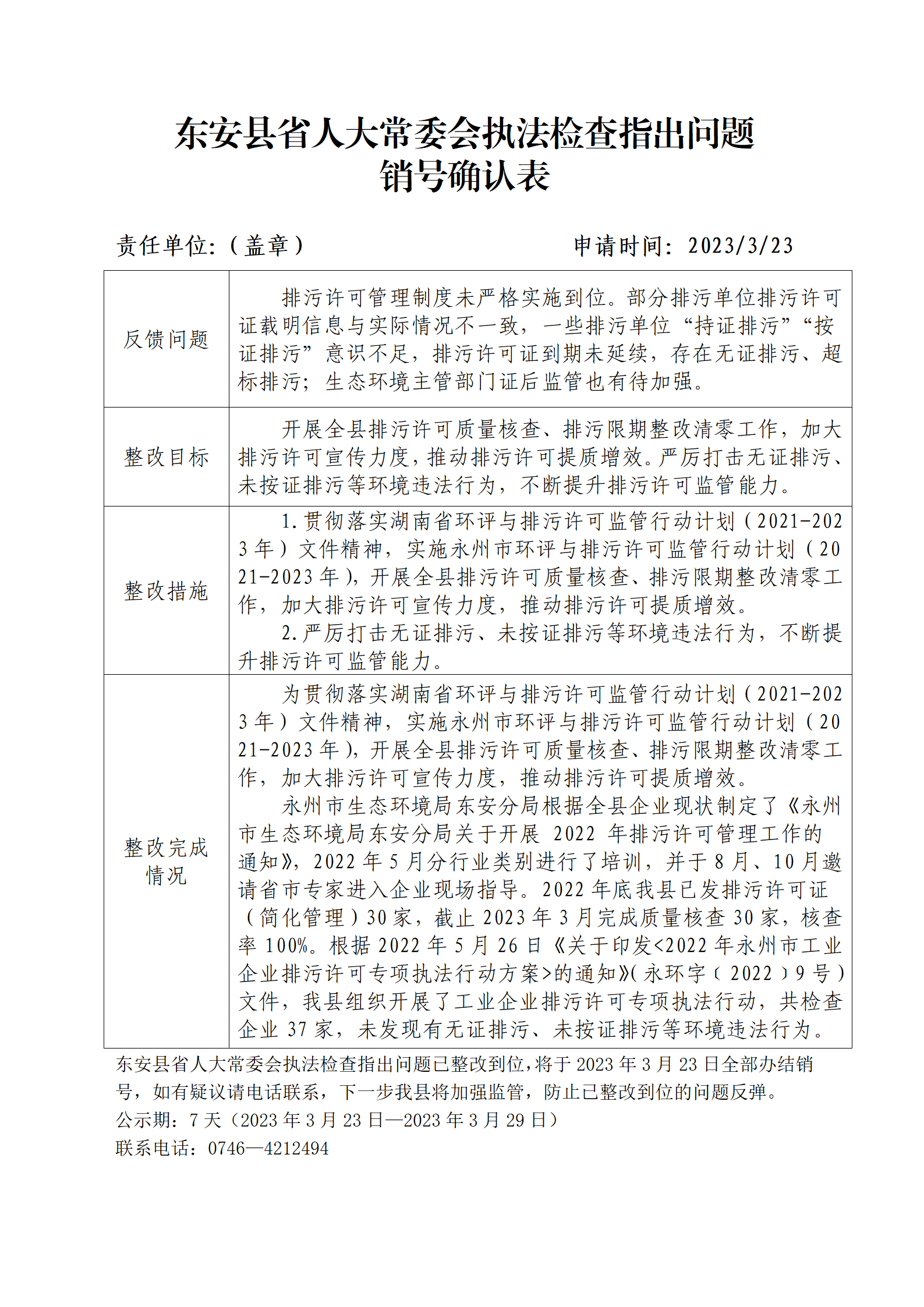 发文机关: 永州市生态环境局东安分局 发文日期: 2023-03-23
