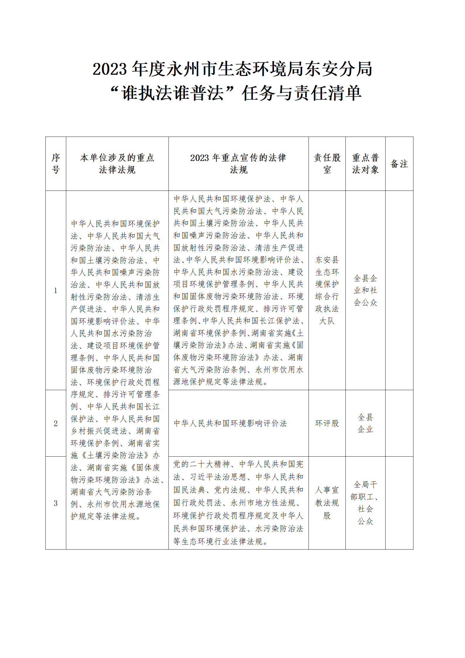 名称: 2023年度永州市生态环境局东安分局“谁执法谁普法”任务与责任清单