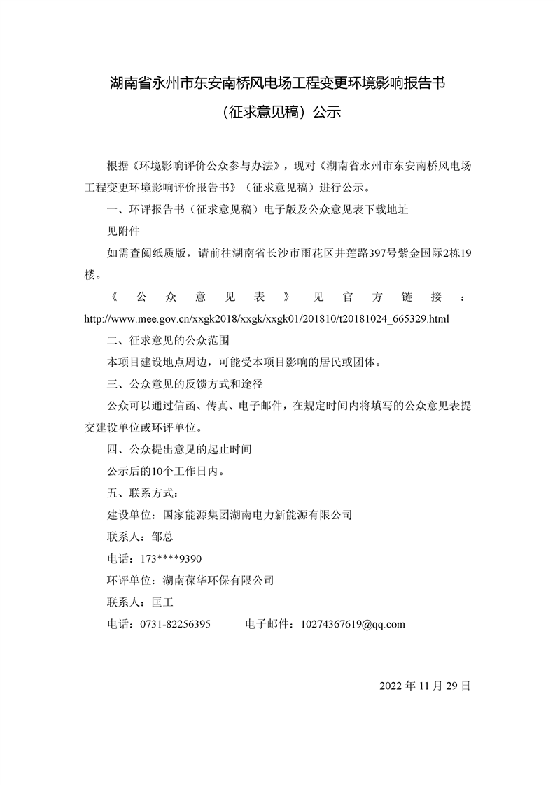 湖南省永州市东安南桥风电场工程变更环境影响报告书(征求意见稿)公示
